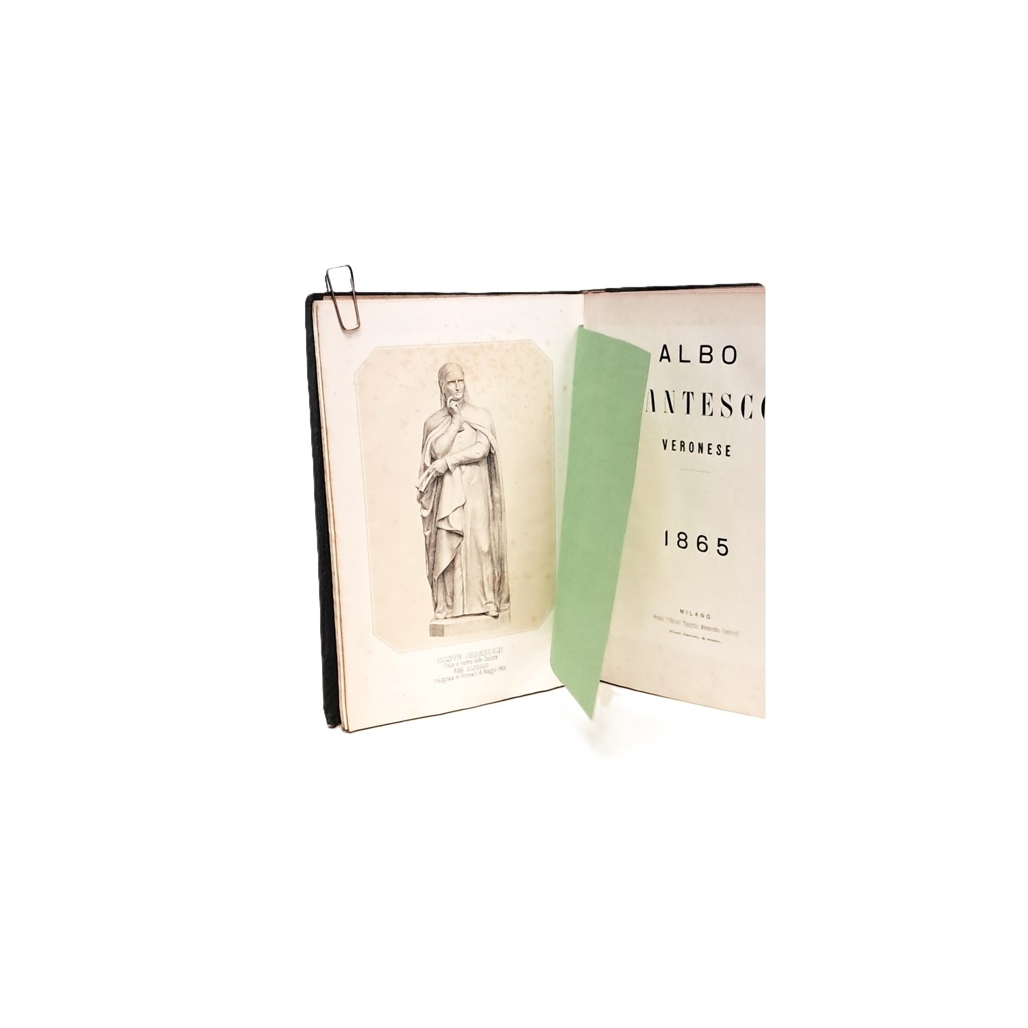 Pubblicazione edita in occasione dell'erezione della statua dedicata a Dante Alighieri in Verona per i 600 anni del poeta. Contiene interventi di vari autori con lo scopo di fare opera patriottica visto che Verona in quel tempo era sotto dominazione austriaca.
