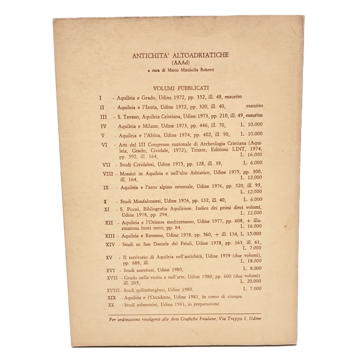 PRIMA EDIZIONE, atti della giornata di studio a Spilimbergo del 28 ottobre 1979; Antichità altoadriatiche volume XVIII della serie.