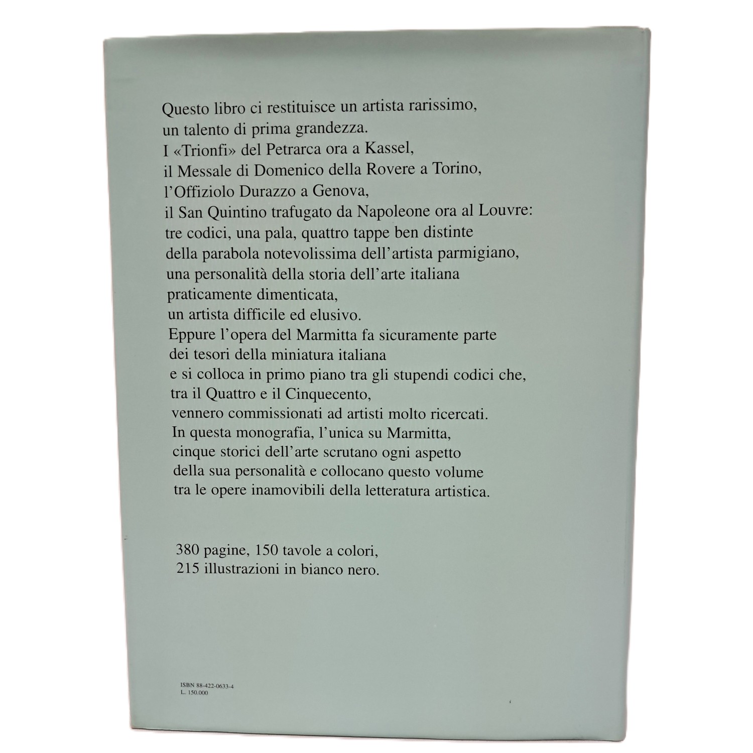 Monografia dell'artista parmigiano, una personalità dell'arte italiana rara e dimenticata. L'opera del Marmitta fa parte dei tesori della miniatura italiana e si colloca in primo piano tra gli stupendi codici che, tra il Quattro e il Cinquecento, vennero commissionati ad artisti molto ricercati. Con interventi di vari autori: La formazione a Bologna di Andrea Bacchi e Andrea De Marchi; Il Petrarca per Giacomo Giglio di Beatrice Bentivolgio-Ravasio; Una commissione romana. Il messale per il Cardinale Domenico della Rovere di Silvana Pettenati; L'Offiziolo Durazzo di Beatrice e Raffaella Bentivoglio-Ravasio; La pala di San Quintino di Andrea Bacchi e Andrea De Marchi. Segue catalogo e regesto curato da Beatrice Bentivoglio-Ravasio.