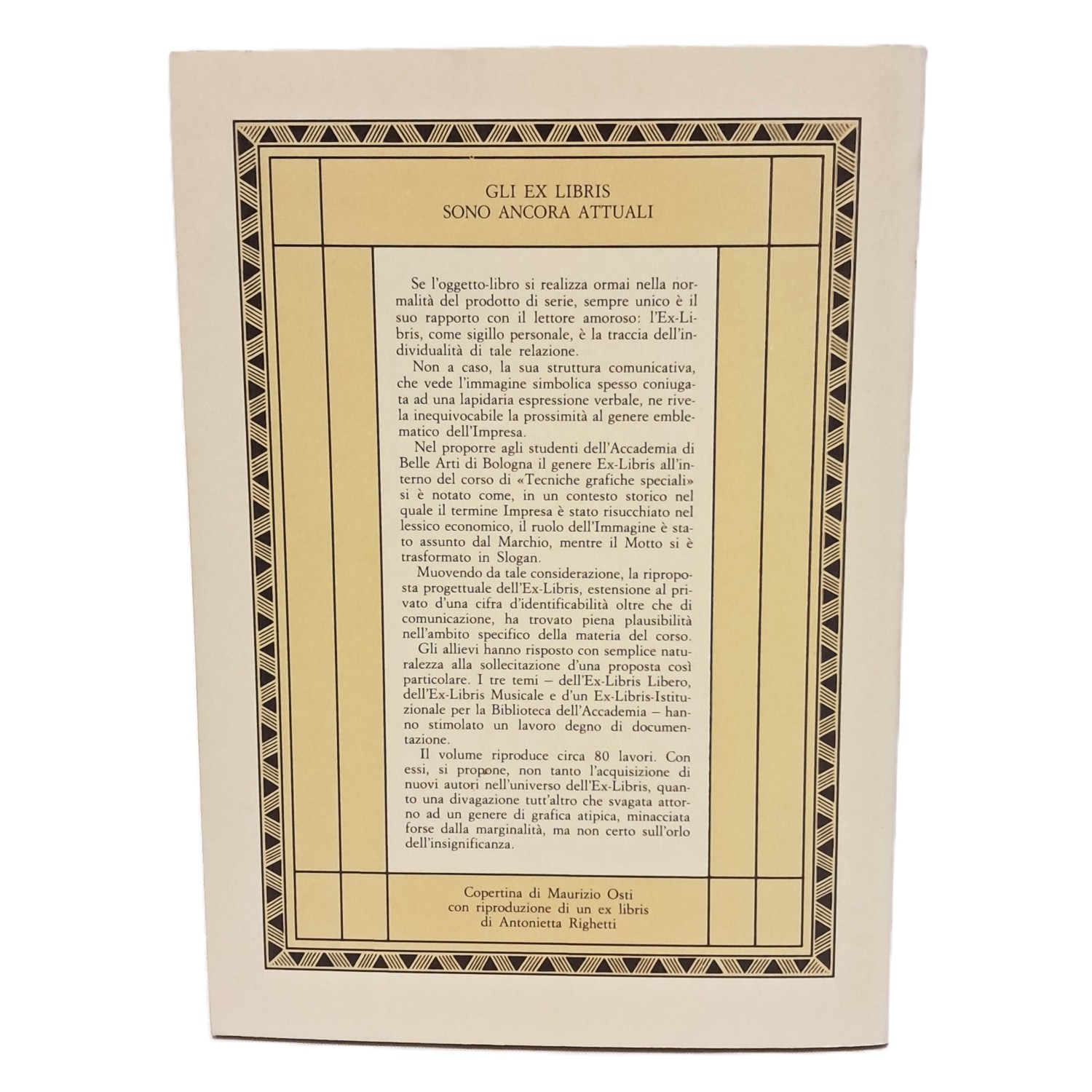 Pubblicazione delle realizzazioni di studenti dell'Accademia di Belle Arti di Bologna sui temi libero, ex musicis e ex libris istituzionale; con la riproduzione di 75 ex libris.