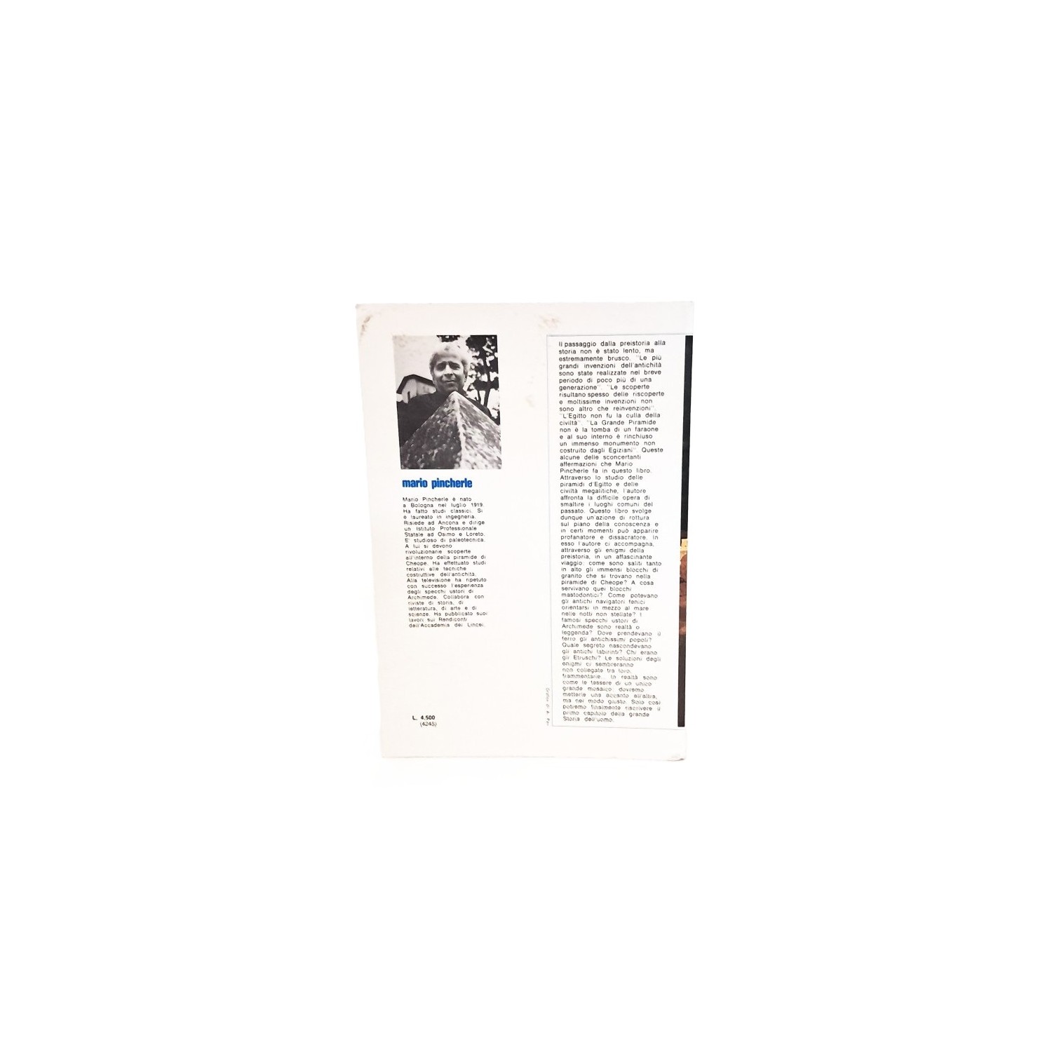 Il passaggio dalla preistoria alla storia non è stato lento, ma estremamente brusco. “Le più grandi invenzioni dell’antichità sono state realizzate nel breve periodo di poco più di una generazione”. “Le scoperte risultano spesso delle riscoperte e moltissime invenzioni non sono altro che reinvenzioni”. “L’Egitto non fu la culla della civiltà”. “La Grande Piramide non è la tomba di un faraone e al suo interno è rinchiuso un immenso monumento non costruito dagli Egiziani”. Queste alcune delle sconcertanti affermazioni che Mario Pincherle fa in questo libro. Attraverso lo studio delle piramidi d’Egitto e delle civiltà megalitiche, l’autore affronta la difficile opera di smaltire i luoghi comuni del passato. Questo libro svolge dunque un’azione di rottura sul piano della conoscenza e in certi momenti può apparire profanatore e dissacratore. In esso l’autore ci accompagna, attraverso gli enigmi della preistoria, in un affascinante viaggio: come sono saliti tanto in alto gli immensi blocchi di granito che si trovano nella piramide di Cheope? A cosa servivano quei blocchi mastodontici? Come potevano gli antichi navigatori fenici orientarsi in mezzo al mare nelle notti non stellate? i famosi specchi ustori di Archimede sono realtà o leggenda? Dove prendevano il ferro gli antichissimi popoli? Quale segreto nascondevano gli antichi labirinti? Chi erano gli Etruschi? Le soluzioni degli enigmi ci sembreranno non collegate tra loro, frammentarie… In realtà sono come le tessere di un unico grande mosaico: dovremo metterle una accanto all’altra, ma nel modo giusto. Solo così potremo finalmente riscrivere il primo capitolo della grande Storia dell’uomo.