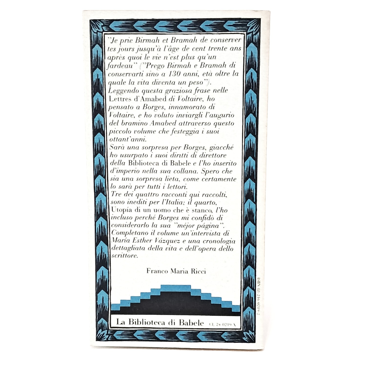 PRIMA EDIZIONE nella collana La biblioteca di Babele curata diretta da Borges, collana di letture fantastiche. Volume realizzato in onore di Borges per il suo 80° compleanno.