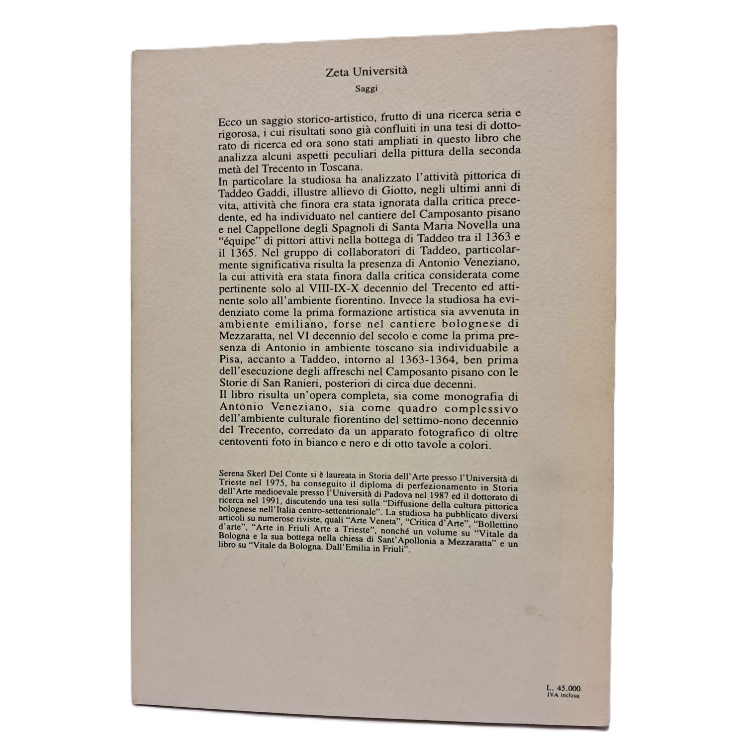 Saggio storico artistico, frutto di una ricerca seria e rigorosa, i cui risultati sono già confluiti in una tesi di dottorato di ricerca ed ora sono stati ampliati in questo volume che analizza alcuni aspetti peculiari della pittura nella seconda metà del Trecento in Toscana. In particolare, la studiosa ha analizzato l'attività pittorica di Taddeo Gaddi, illustre allievo di Giotto, negli ultimi anni di vita, attività che finora era stata ignorata dalla critica, ed ha individuato nel cantiere del Camposanto pisano e nel Cappellone degli Spagnoli di Santa Maria Novella una équipe di pittori attivi nella bottega di Taddeo tra il 1363 e il 1365. Nel gruppo risulta particolarmente attiva la presenza di Antonio Veneziano, la cui attività era stata finora dalla critica considerata come pertinente solo al VIII-IX-X decennio del Trecento ed attinente solo all'ambito fiorentino.