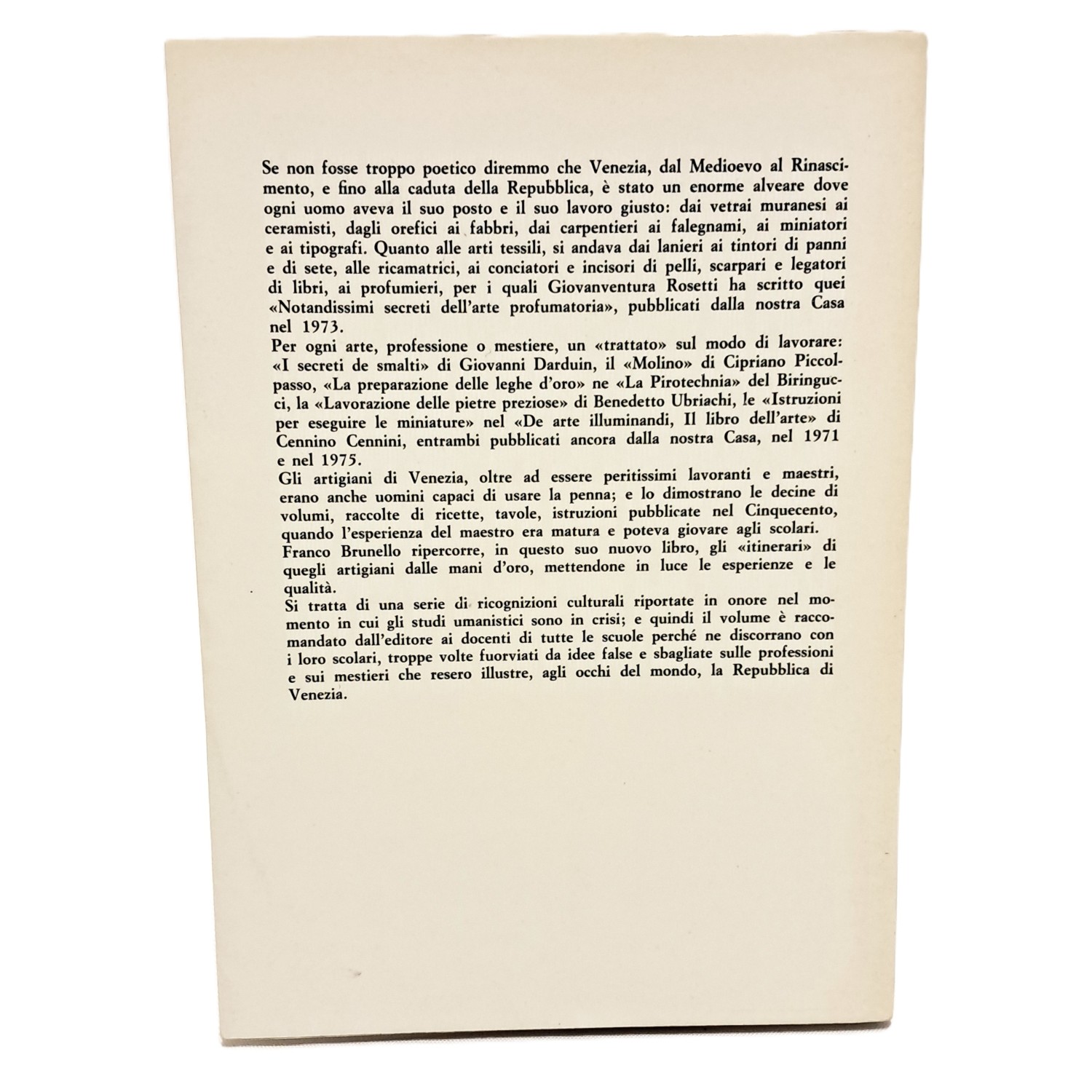 Venezia era un enorme alveare dove ogni uomo aveva il suo posto e il suo lavoro giusto: dai vetrai muranesi ai ceramisti, dagli orefici ai fabbri, dai carpentieri ai falegnami, ai miniatori e ai tipografi. Quanto alle arti tessili, si andava dai lanieri ai tintori di panni e di sete, alle ricamatrici, ai conciatori e incisori di pelli, scarpari e legatori di libri, ai profumieri. Ogni capitolo è dedicato a un diverso mestiere artigiano: l'arte vetraria, ceramica, la lavorazione dei metalli, del legno, le arti grafiche, la miniatura, le arti tessili, l'arte tintoria, la concia delle pelli e la lavorazione del cuoio, la profumeria e la cosmesi.