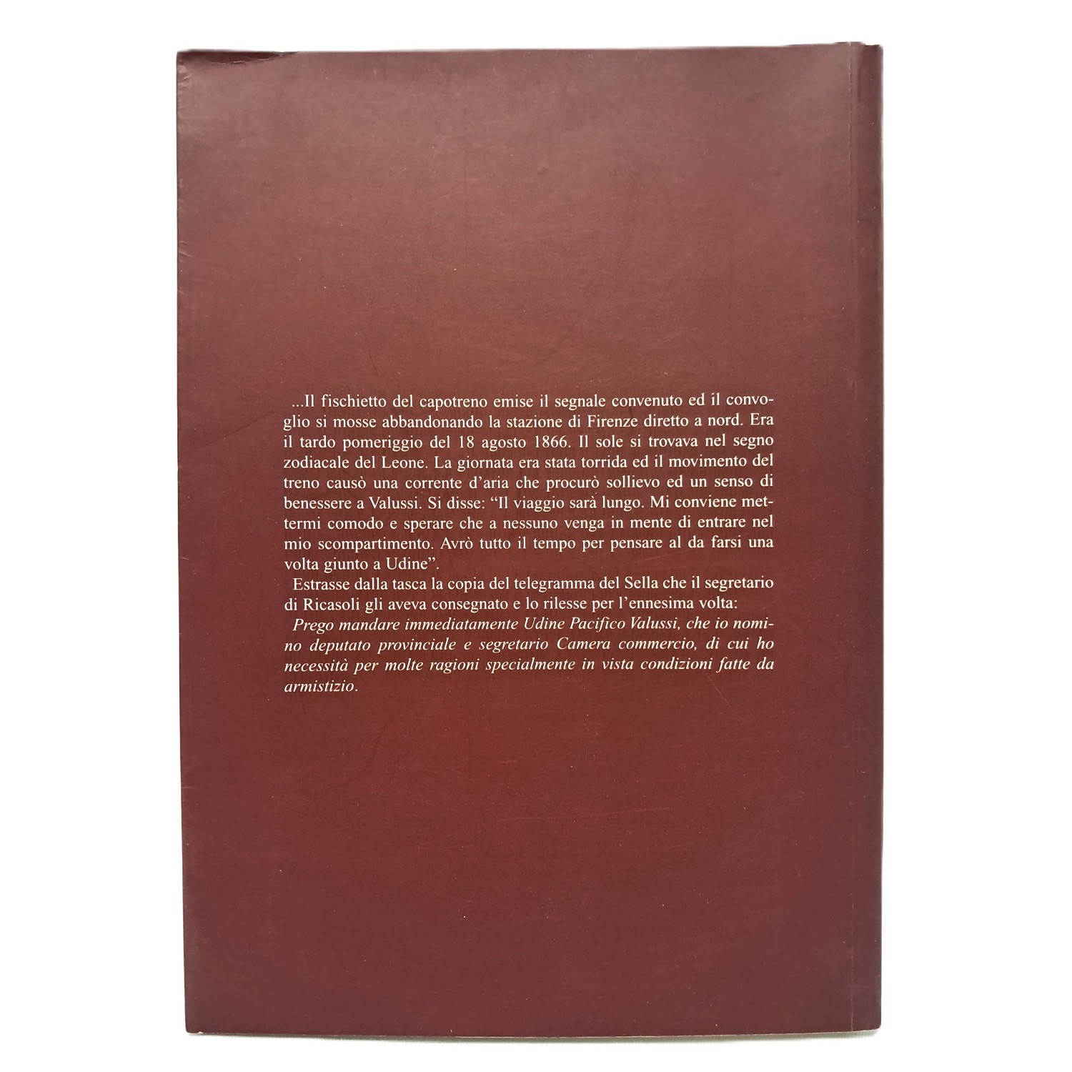 ..Il fischietto del capotreno emise il segnale convenuto ed il convoglio si mosse abbandonando la stazione di Firenze diretto a nord. Era il tardo pomeriggio del 18 agosto 1866. Il sole si trovava nel segno zodiacale del Leone. La giornata era stata torrida ed il movimento del treno causò una corrente d'aria che procurò sollievo ed un senso di benessere a Valussi. Si disse: "Il viaggio sarà lungo. Mi conviene mettermi comodo e sperare che a nessuno venga in mente di entrare nel mio scompartimento. Avrò tutto il tempo per pensare al da farsi una volta giunto a Udine". Estrasse dalla tasca la copia del telegramma del Sella che il segretario di Ricasoli gli aveva consegnato e lo rilesse per l'ennesima volta: Prego mandare immediatamente Udine Pacifico Valussi...