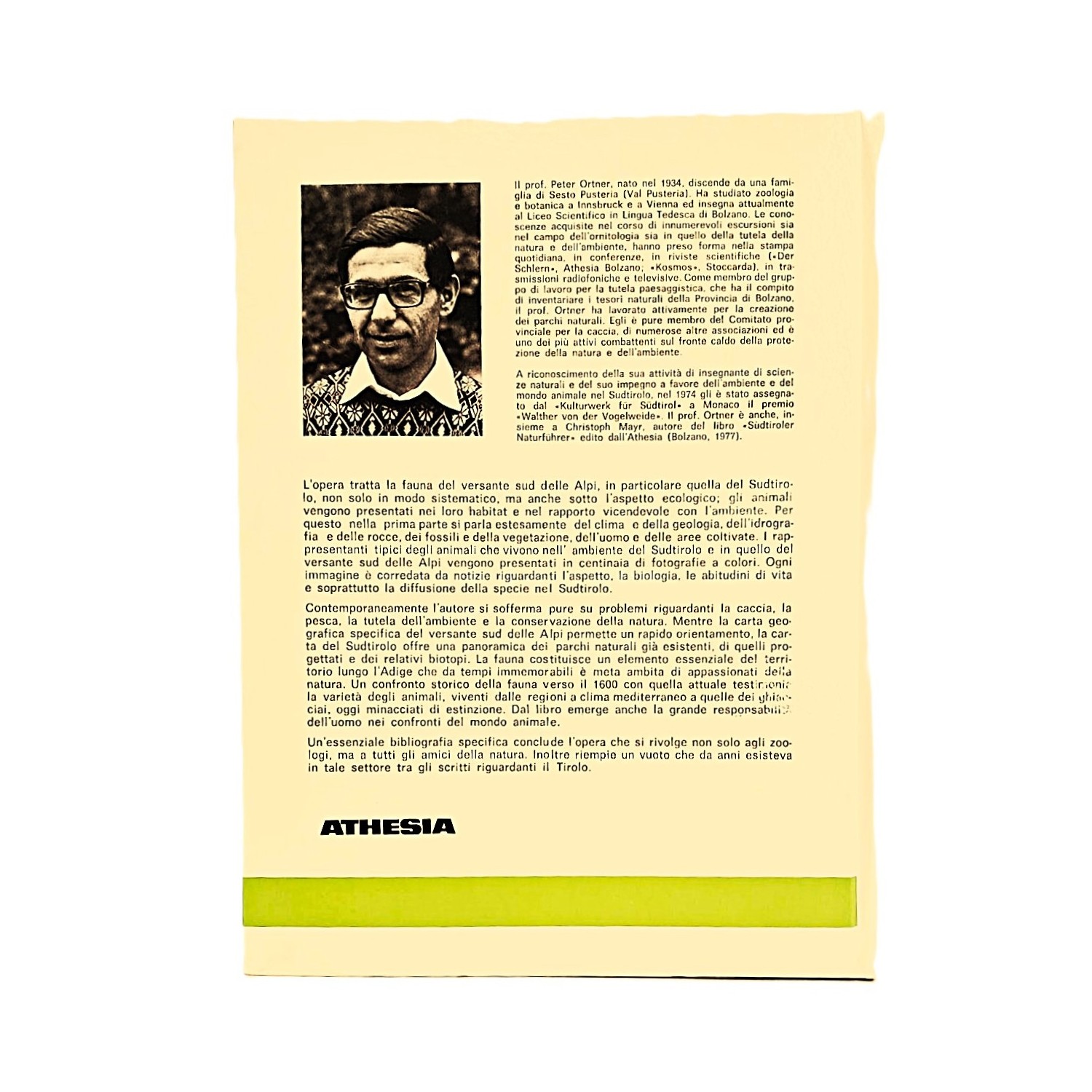 L'opera tratta la fauna del versante sud delle Alpi, in particolare quella del Sudtirolo, non solo in modo sistematico, ma anche sotto l'aspetto ecologico; gli animali vengono presentati nei loro habitat e nel rapporto vicendevole con l'ambiente. Per questo nella prima parte si parla esattamente del clima e della geologia, dell'idrografia e delle rocce, dei fossili e della vegetazione, dell'uomo e delle aree coltivate. I rappresentanti tipici degli animali che vivono nell'ambiente del Sudtirolo e in quello del versante Sud delle Alpi vengono presentati in centinaia di foto a colori.